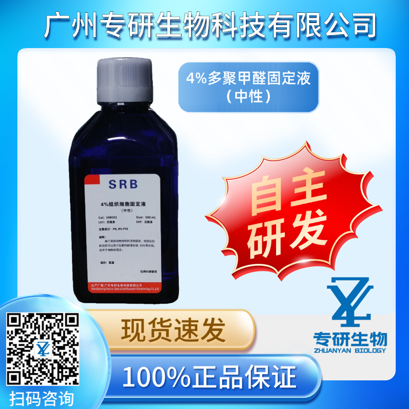 本产品为多聚甲醛固定液(中性),有效成分为4%多聚甲醛,以0.1 M磷酸缓冲液为溶剂,pH 7.0-7.5@25℃。本产品适用于绝大多数动物组织的固定。
