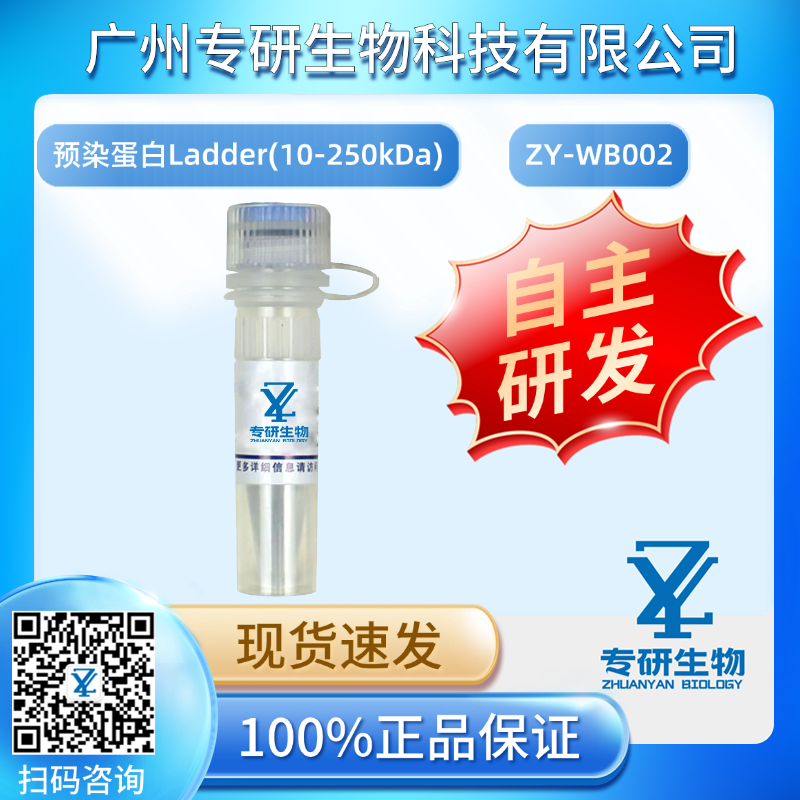 产品介绍:本预染蛋白标准分子量 Marker 包含了从 10kDa 到 250kDa 共12 种高度纯化并预染的重组蛋白质(10,15,20,25,33,45,60,77,100,140,180,250kDa),其中77kDa条带为橙红色,25kDa 为绿色。适合作为 SDS-PAGE 和 Western 的蛋白质分子量标准。本预染蛋白标准分子量 Marker 已经配制在 1×SDS-PAGE 上样缓冲液中,直接使用,不要煮沸、稀释和加入还原剂处理。根据上样孔的大小,本预染蛋白标准分子量Marker 通常每次上样 5-10μl(5×1.5mm 胶孔 5μl 足够),即可在电泳时、电泳后和转膜后观察到非常清楚的蛋白条带。储存液:20mM Tris-H3PO4, pH7.5, 2mM EDTA, 1.5% (W/V)SDS,15 %(V/V) Glycerol, 3mMDTT,0.1% (V/V) Proclin300,4M Urea。
