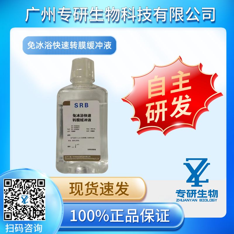 本产品为即用型免冰浴快速转膜缓冲液,是一种安全无害的用于Western Blot时湿转快速转膜的即用型缓冲液,能高效快速地将蛋白转移到印迹膜上;能在15-30 min内完成转膜过程。