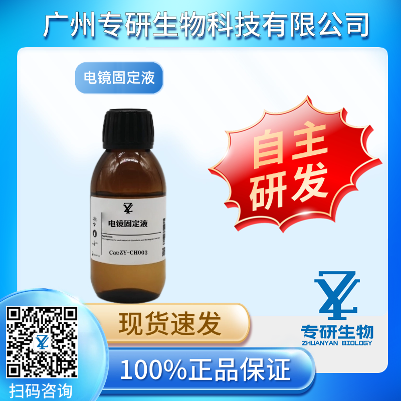 固定的目的在于保存细胞和组织的原有形态结构,固定剂能阻止内源性溶酶体酶对自身组织和细胞的自溶、抑制细菌和霉菌的生长,固定剂通过凝固、生成添加化合物等使蛋白质内部结构发生改变,从而使酶失活,固定剂对细胞核细胞外成分发生物理改变。固定液主要分为醛类固定液、汞类固定液、醇类固定液、氧化剂类固定液、苦味酸盐类固定液等,较为常用的是醛类中的福尔马林、醇类中的乙醇;戊二醛固定液会引起蛋白质α-螺旋结构变形,不利于过氧化物酶染色,固定速度快,渗透力差。戊二醛固定液(2.5%,电镜专用)由戊二醛、磷酸盐、去离子水等组成,pH7.2~7.4,该固定液对细胞核、细胞浆的细微结构固定效果好,经常用于电镜标本的固定。