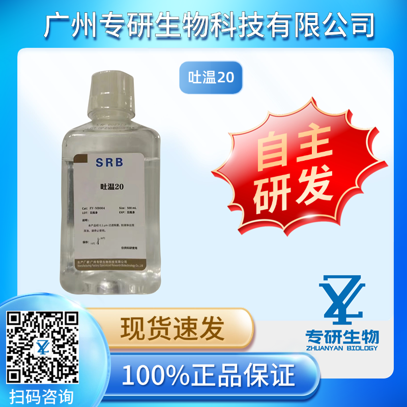 吐温-20(Tween-20),又称聚山梨酯-20(Polysorbate-20)或聚乙氧基月桂酸清凉茶醇,一种来源于山梨聚糖类酯的吐温类非离子型表面活性剂,易混溶于水。在生物化学研究领域及生物医药领域使用广泛,包括但不限于以下应用: